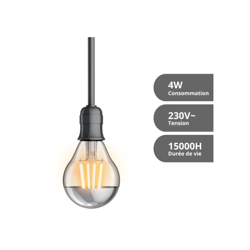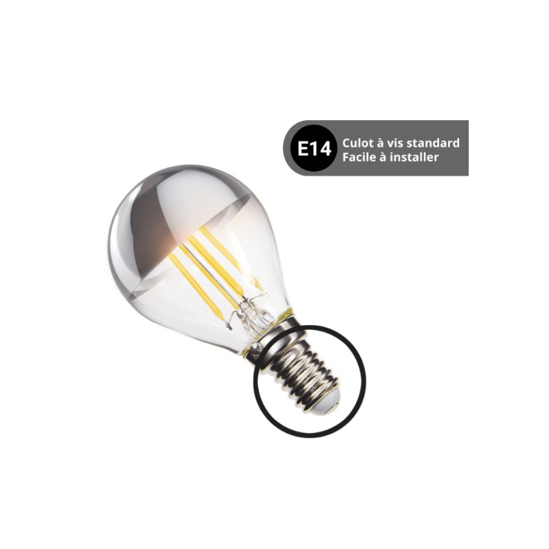 Cette ampoule LED filament P45 argentée est conçue pour les luminaires à petit culot E14. Son installation est simple et rapide : il suffit de la visser.