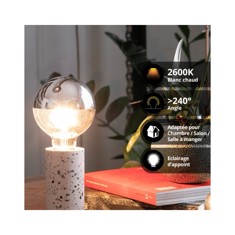 Installez cette ampoule dans une lampe avec abat-jour clair ou une applique murale ouverte : la finition argentée créera de légers reflets élégants tout en conservant une lumière douce et chaleureuse.