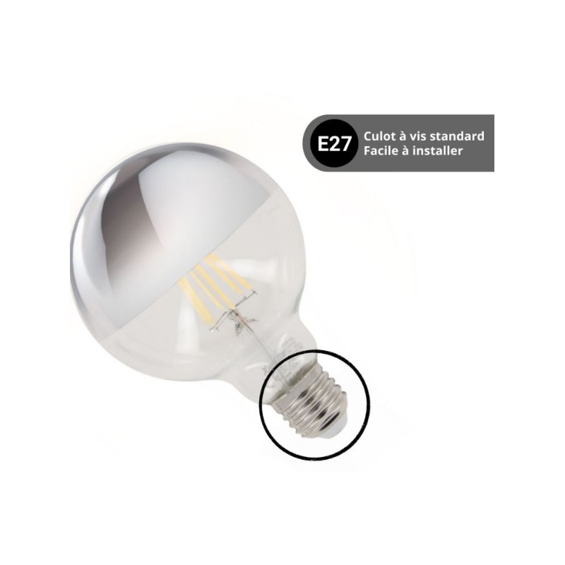 Cette ampoule filament LED G95 argentée au culot E27 s’installe facilement sur la majorité des luminaires.