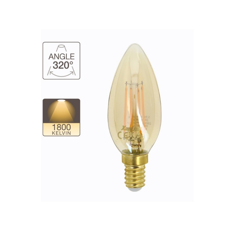 Ampoule LED Flamme au verre ambré, culot E14, 350 lumens, lumière blanc chaud 1800K. Consommation seulement 3,8W (équivalent 30W), idéale pour créer une ambiance chaleureuse et vintage dans vos chambres, salons ou salles à manger. Installation facile et durable avec une durée de vie de 15 000 h.