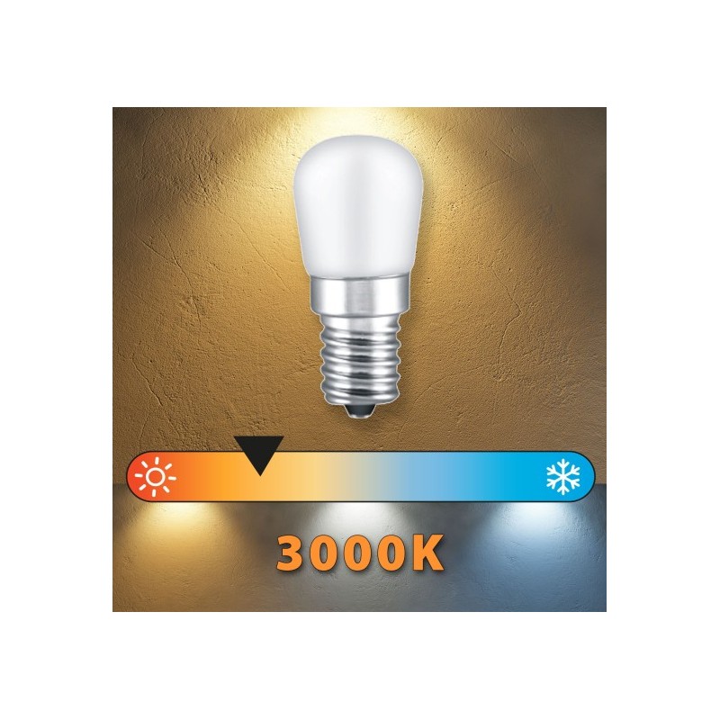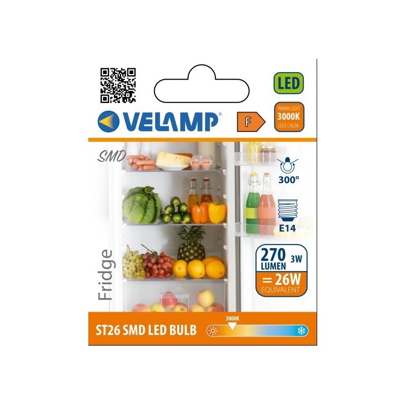 Ampoule LED VELAMP ST26 spéciale réfrigérateur, 3W avec culot E14, offrant 270 lumens de lumière instantanée. Sa lumière blanc chaud 3000K assure un éclairage confortable et naturel. Compacte, économique et durable, elle est idéale pour frigo, hotte de cuisine et petits luminaires compatibles.