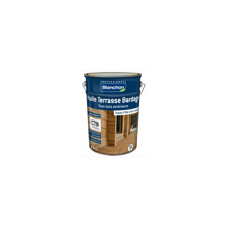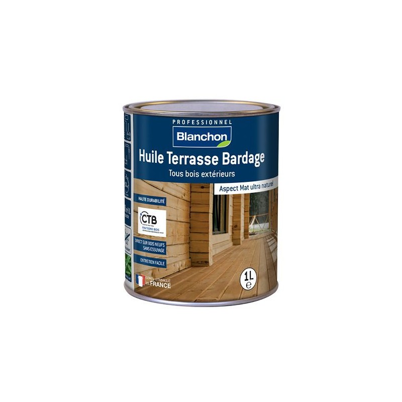 Huile de Terrasse et Bardage de chez Blanchon est de haute durabilité. Protège tous les bois extérieurs, ralentit le grisaillement, effet perlant et entretien facile sans ponçage.